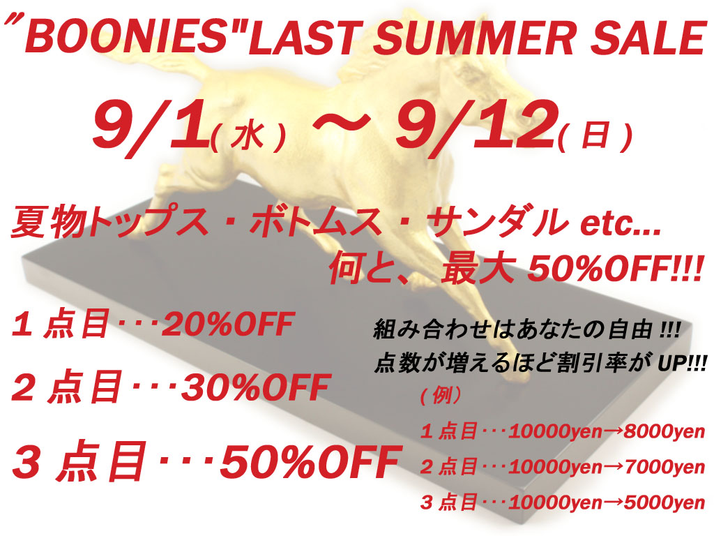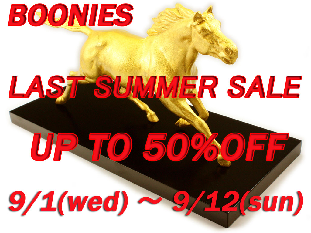 最近、質問が増えて有り難い限りです!! なかなかお店に来れない遠方の方や、商品チェックで見てくれてる近隣の方と色々いらっしゃいますが嬉しいですね☆ 詳しくは『BOONIES ONLINESHOP』をクリック!! 是非ともチェックして下さ~い!! もう明日で、8月も終わりですね~!! 気合い入れて頑張りましょうかねっ☆ では!! |